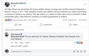 এর আগে ভারতের সেনাবাহিনীও বিজয় দিবস উপলক্ষে একটি আলাদা পোস্ট দেয়। সেই পোস্টে তারা মুক্তিযোদ্ধাদের বীরত্বের কথা উল্লেখ করে জানায়, বিজয় দিবস শুধুমাত্র একটি তারিখ নয়; এটি ১৯৭১ সালের যুদ্ধে ভারতীয় সশস্ত্র বাহিনীর ঐতিহাসিক ও চূড়ান্ত বিজয়ের প্রতীক।