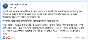 সারজিস আলম তার পোস্টে লিখেছেন, “জুলাই সনদের মাধ্যমে মৌলিক সংস্কার বাস্তবায়নে যারাই বাধা হয়ে দাঁড়াবে, তাদের মুখোশ জনগণের সামনে উন্মোচন করা হবে। জুলাই সনদ বাস্তবায়নের নিশ্চয়তার পর অন্য আলাপের শুরু হতে পারে। তার আগে না।”